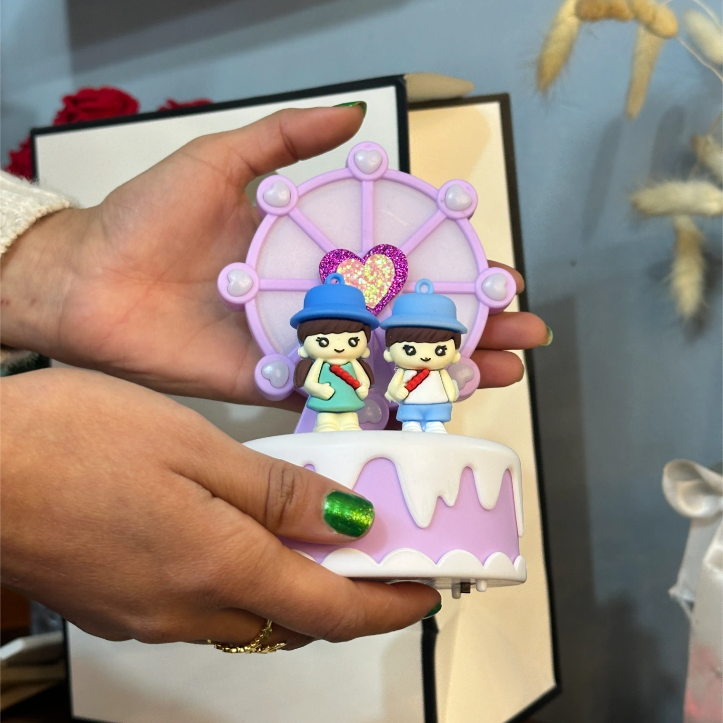 Keepsakes: Rotating Couple Ferris Wheel Statue, Cute Keyring, and a "Just for You" Mini Flower Bouquet.