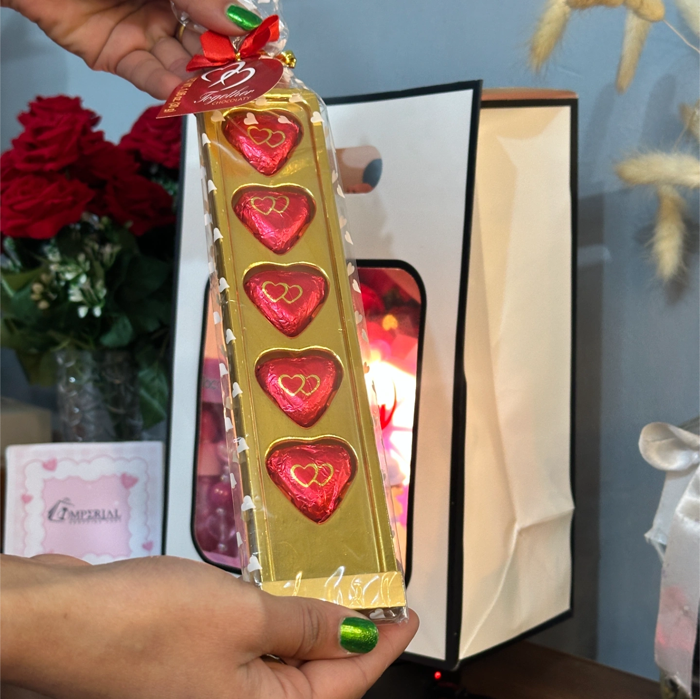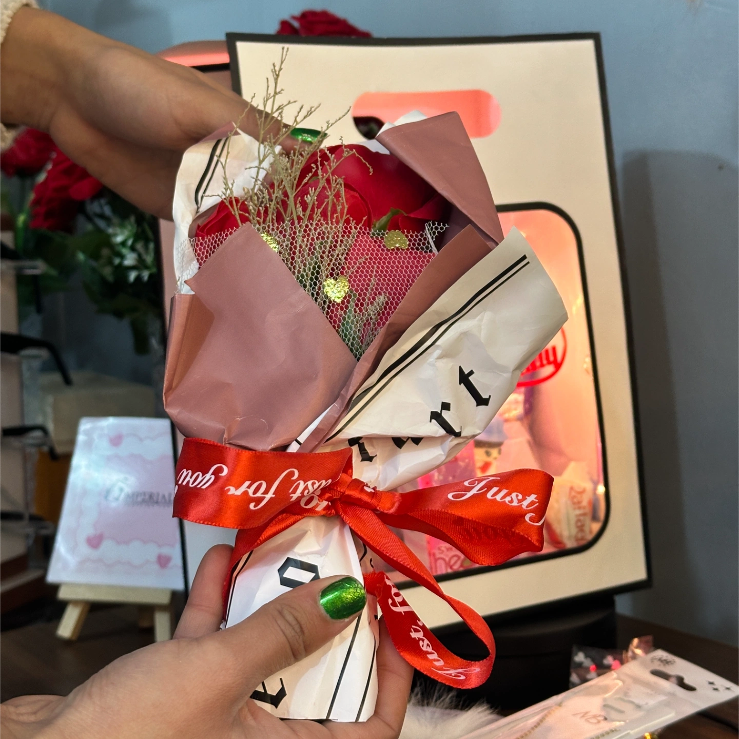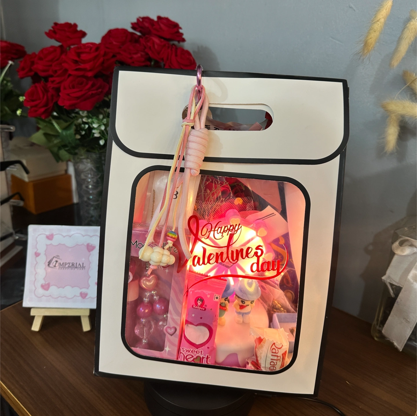 The Extras: Soft Headband, a handwritten Valentine’s Card, and a luxury Gift Bag with an illuminated "Happy Valentine’s Day" tag.