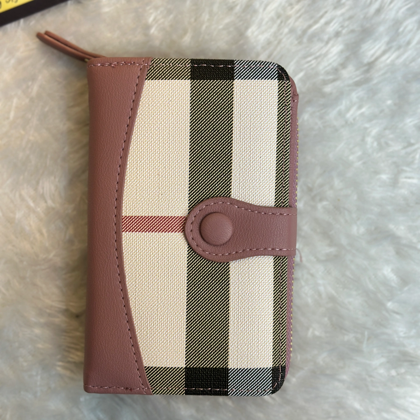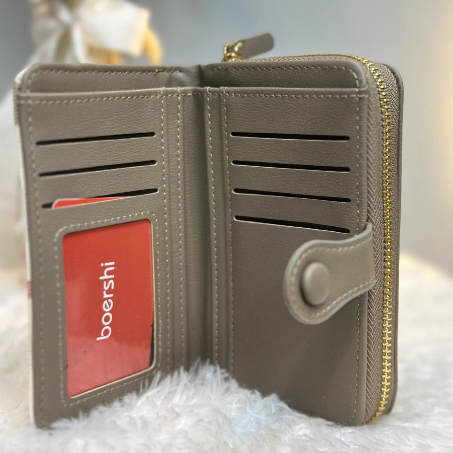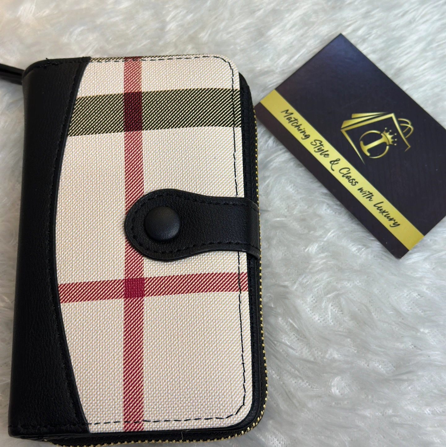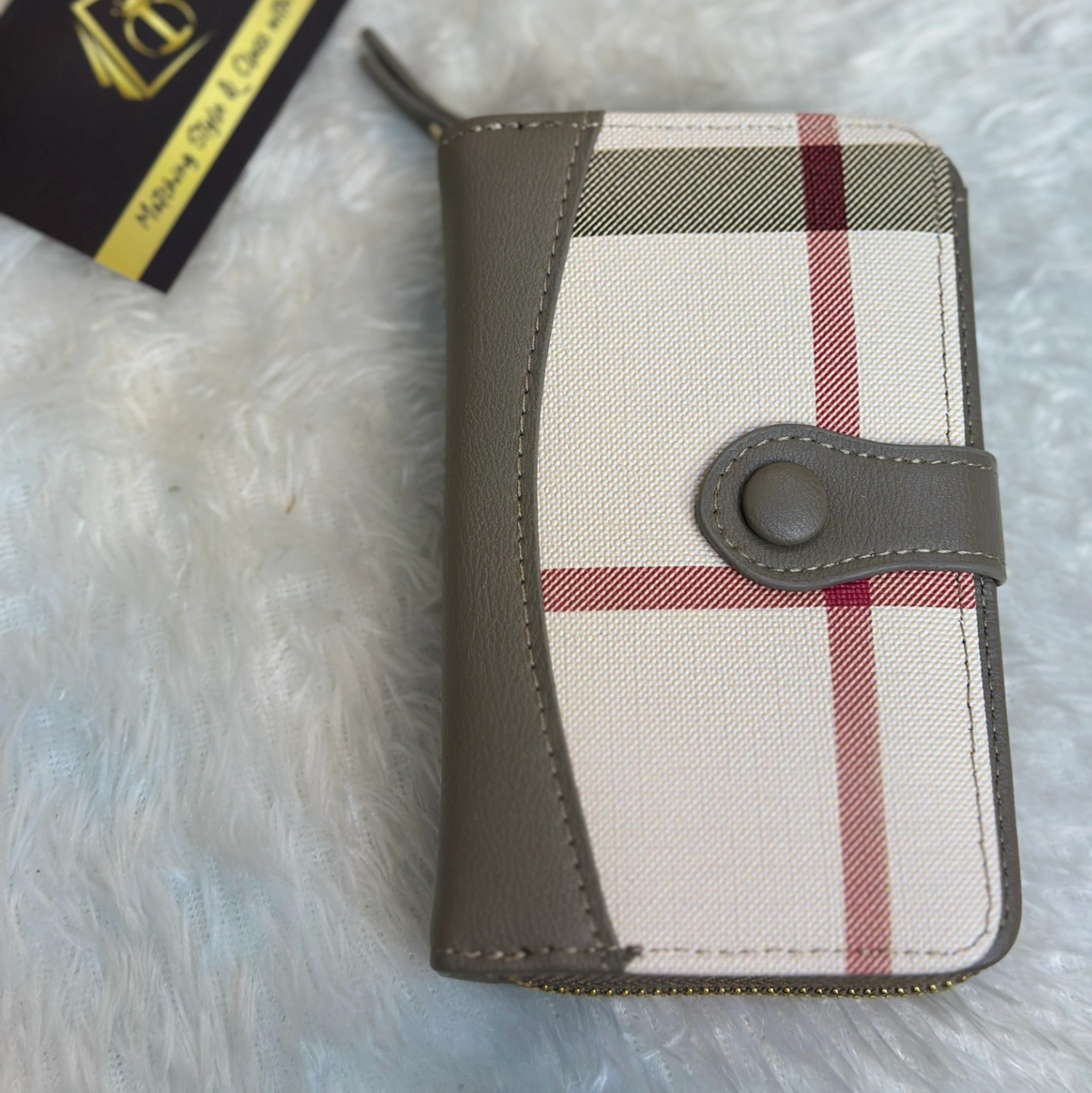 For those who love neutrals, this taupe edition offers a soft, earthy aesthetic. The muted brown-grey trim complements the red and black lines of the plaid canvas beautifully. It is designed to be compact yet spacious enough for all your essential cards and cash.