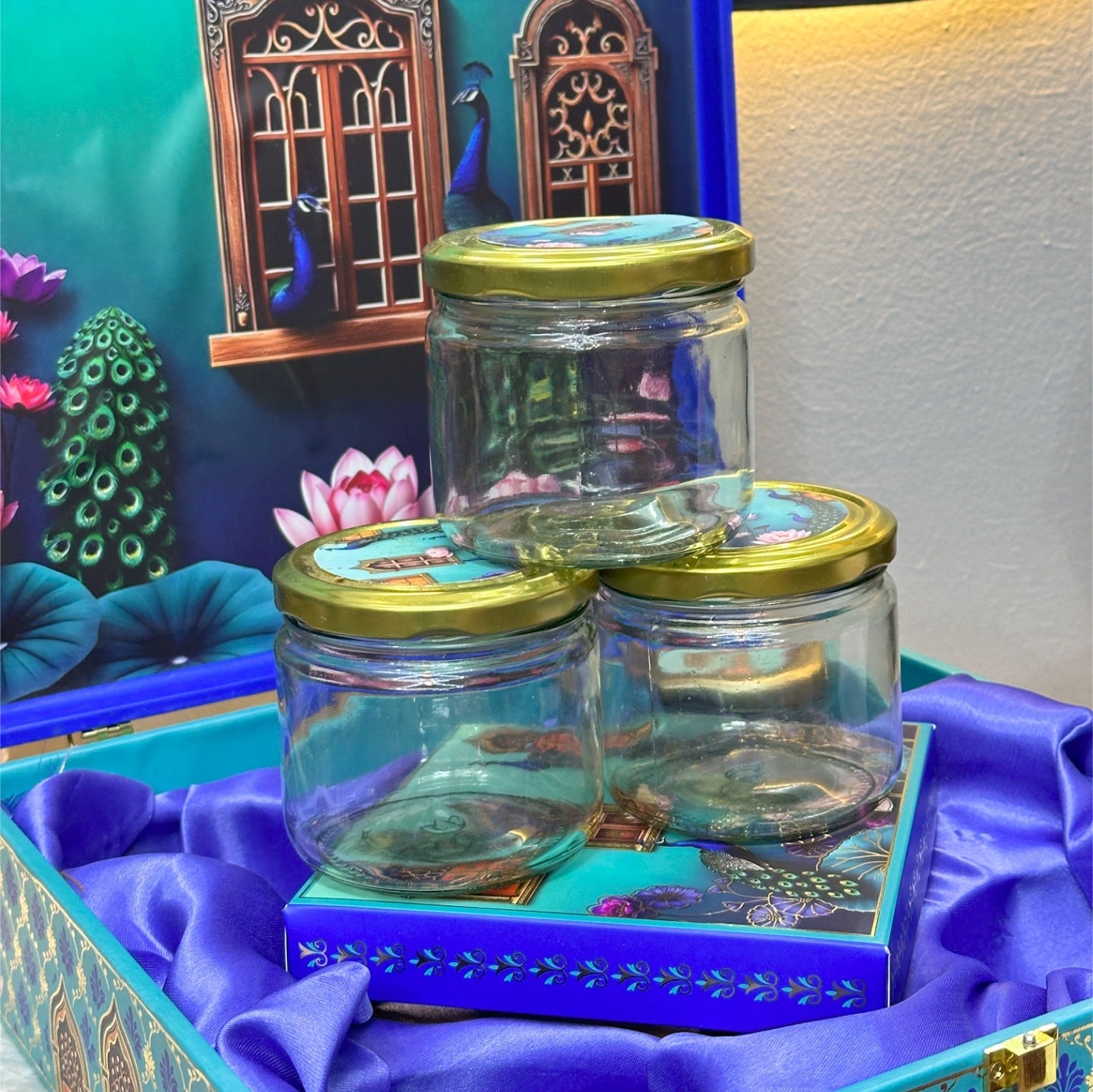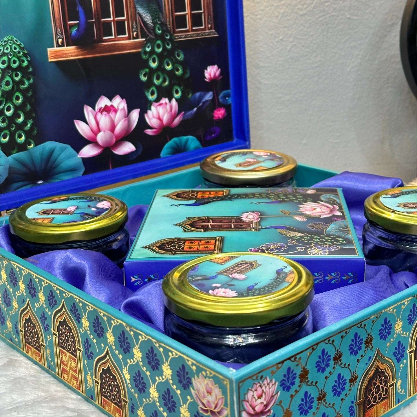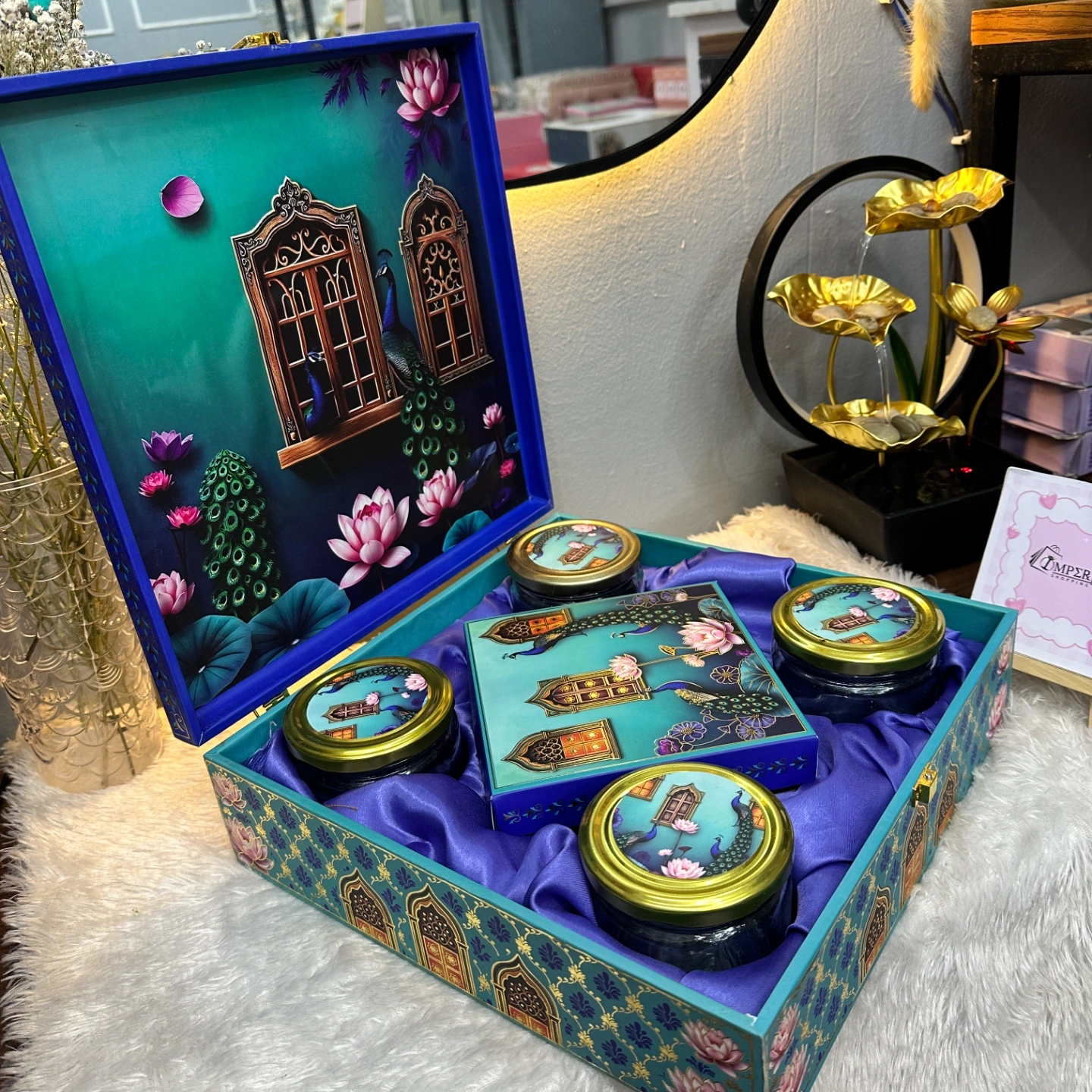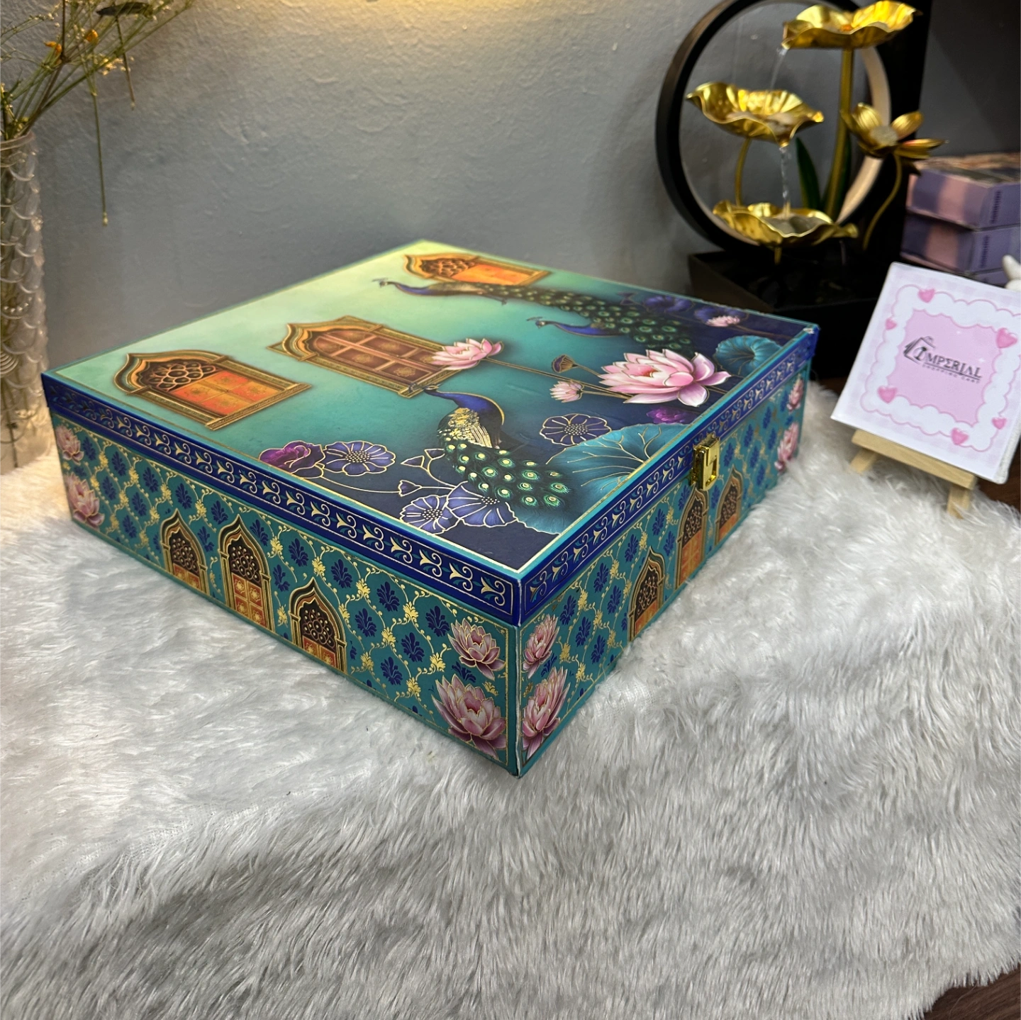 Box Style: Deep blues and sea-greens with ornate windows (Jharokha), pink lotuses, and peacocks.
