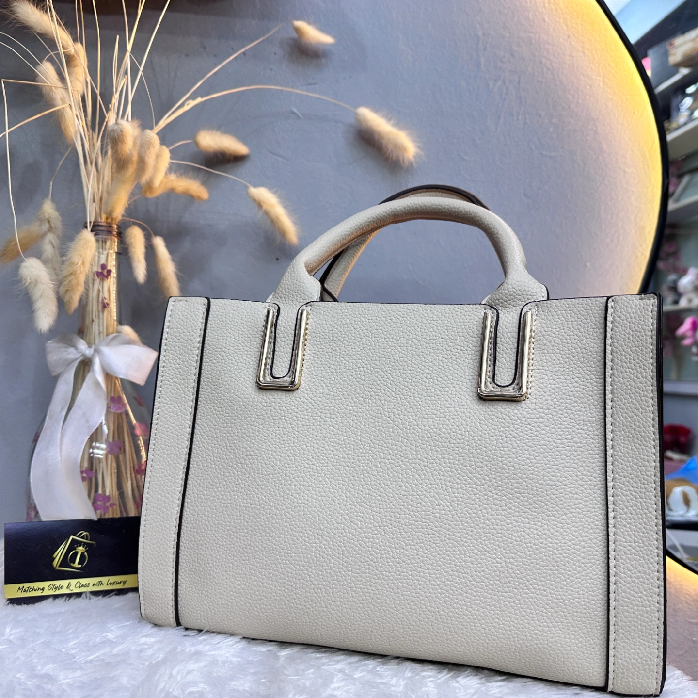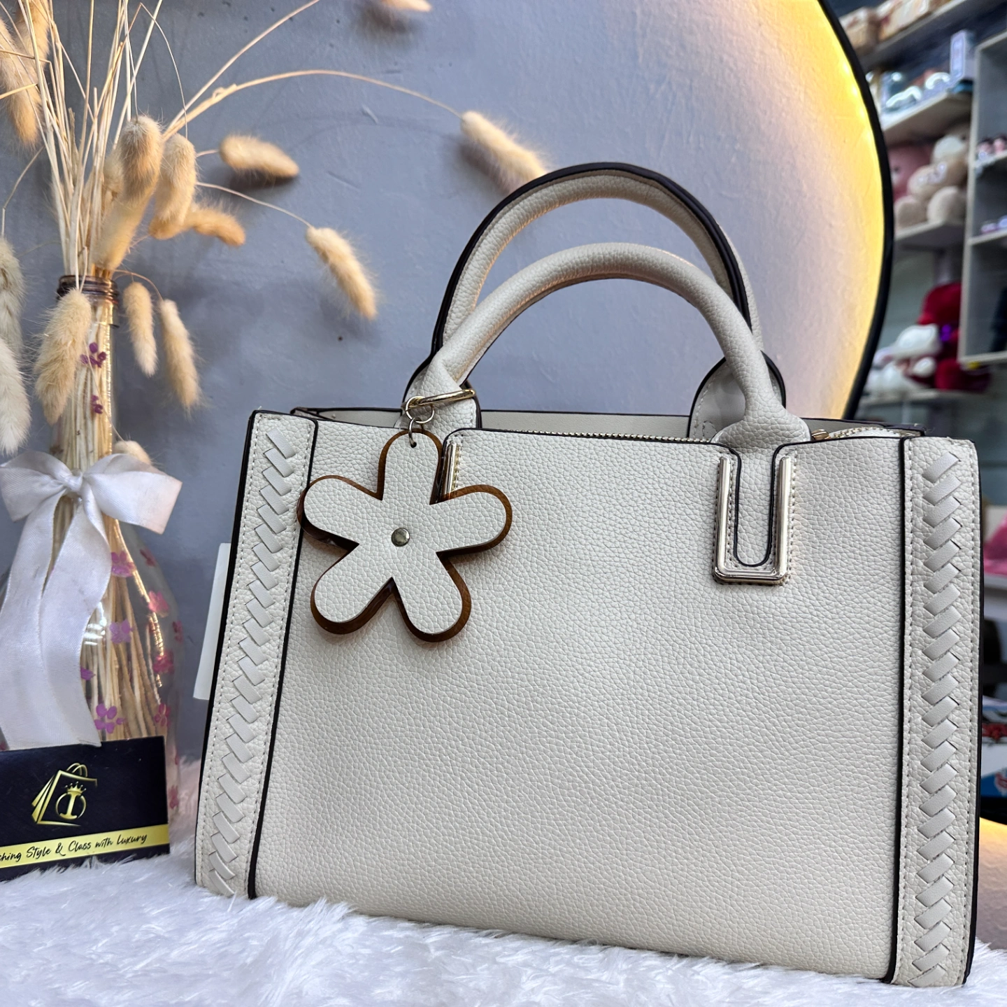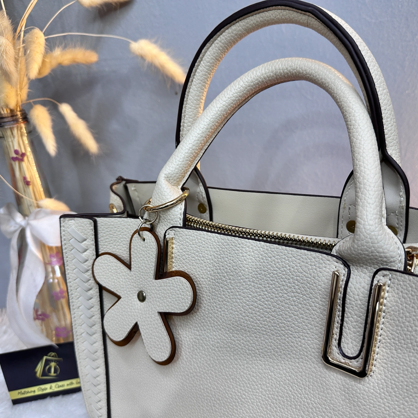 A clean, modern white tote with intricate braided edge detailing. The oversized flower charm adds a whimsical touch to this otherwise sharp, structured silhouette.