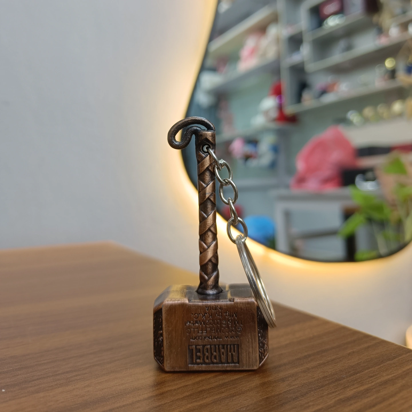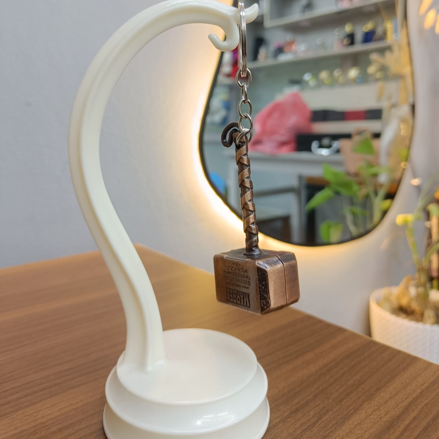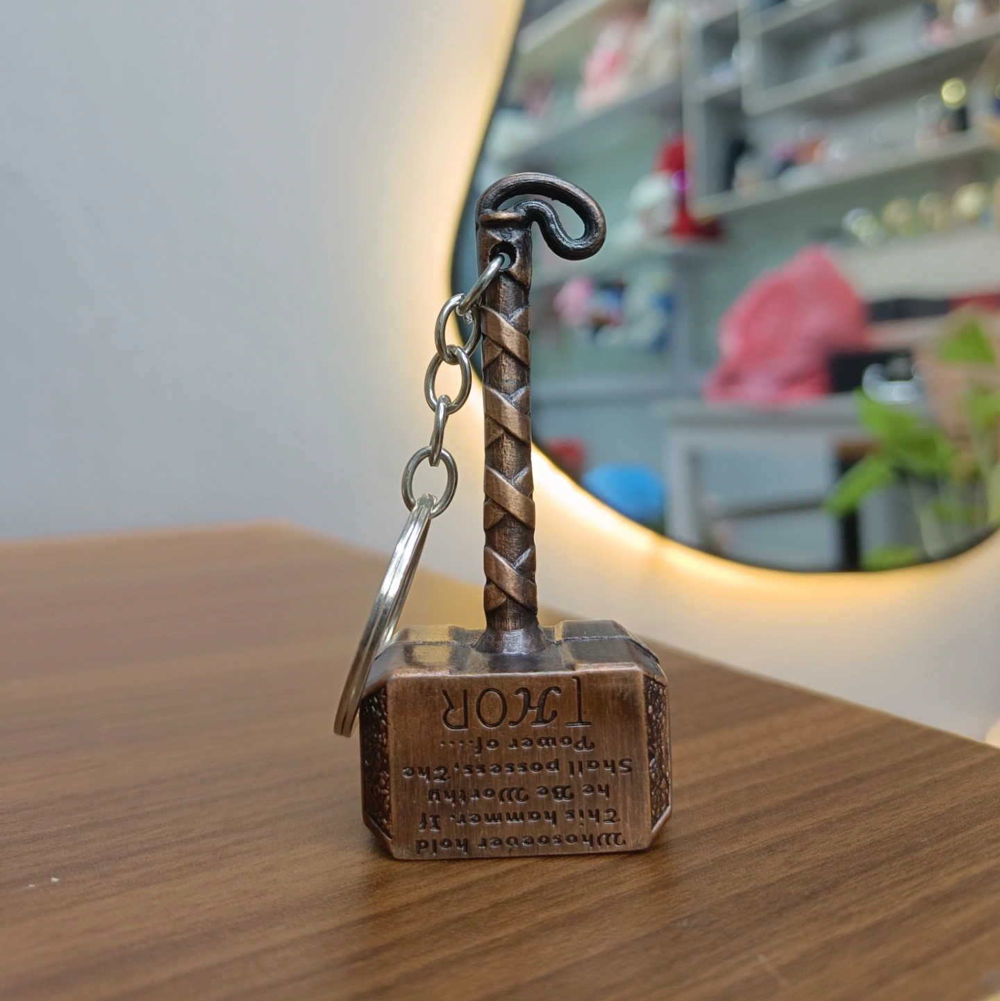 A static Mjolnir replica with a gold or brass-toned finish that emphasizes its famous inscription: "Whosoever holds this hammer, if he be worthy, shall possess the power of Thor." This version focuses on the central theme of the hammer's enchantment.