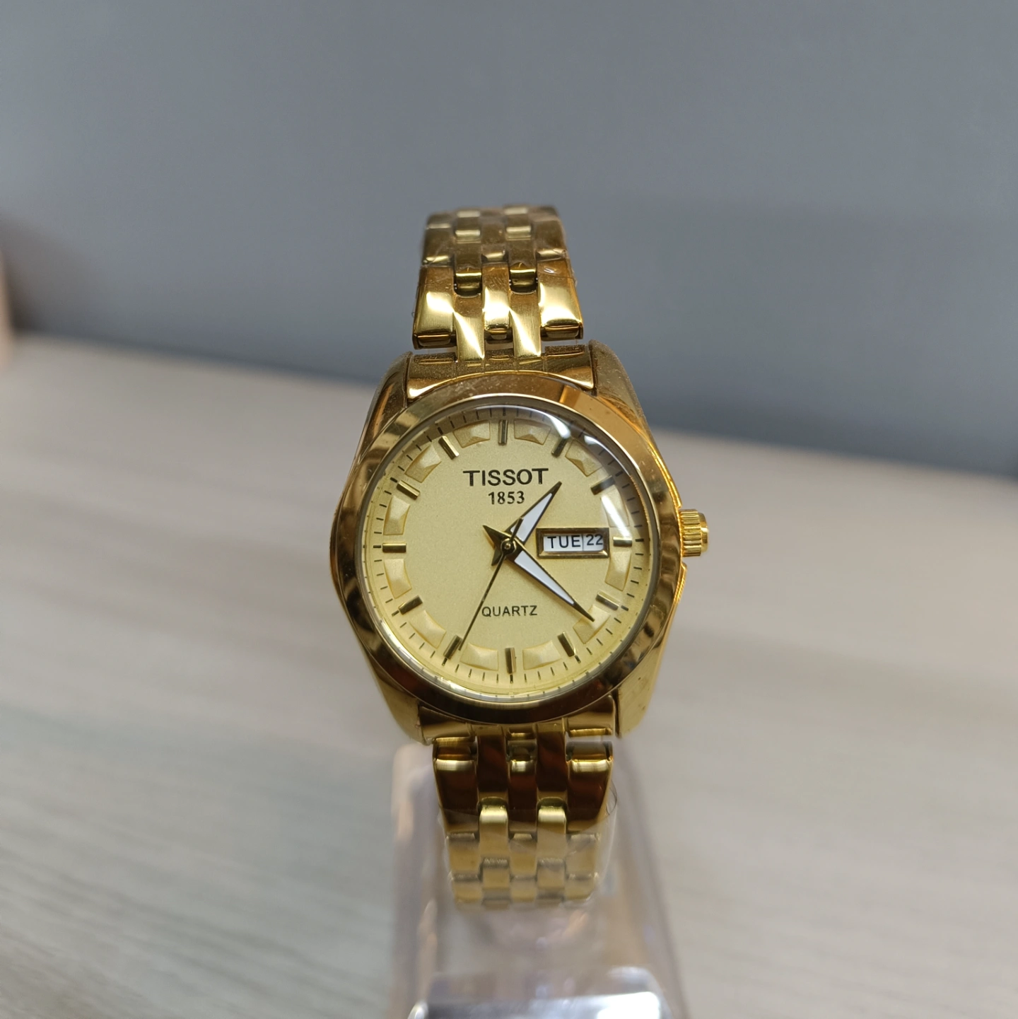 Featuring a gleaming gold-toned case and bracelet, it presents a luminous dial accented by a convenient day and date window. A timeless design for everyday luxury.