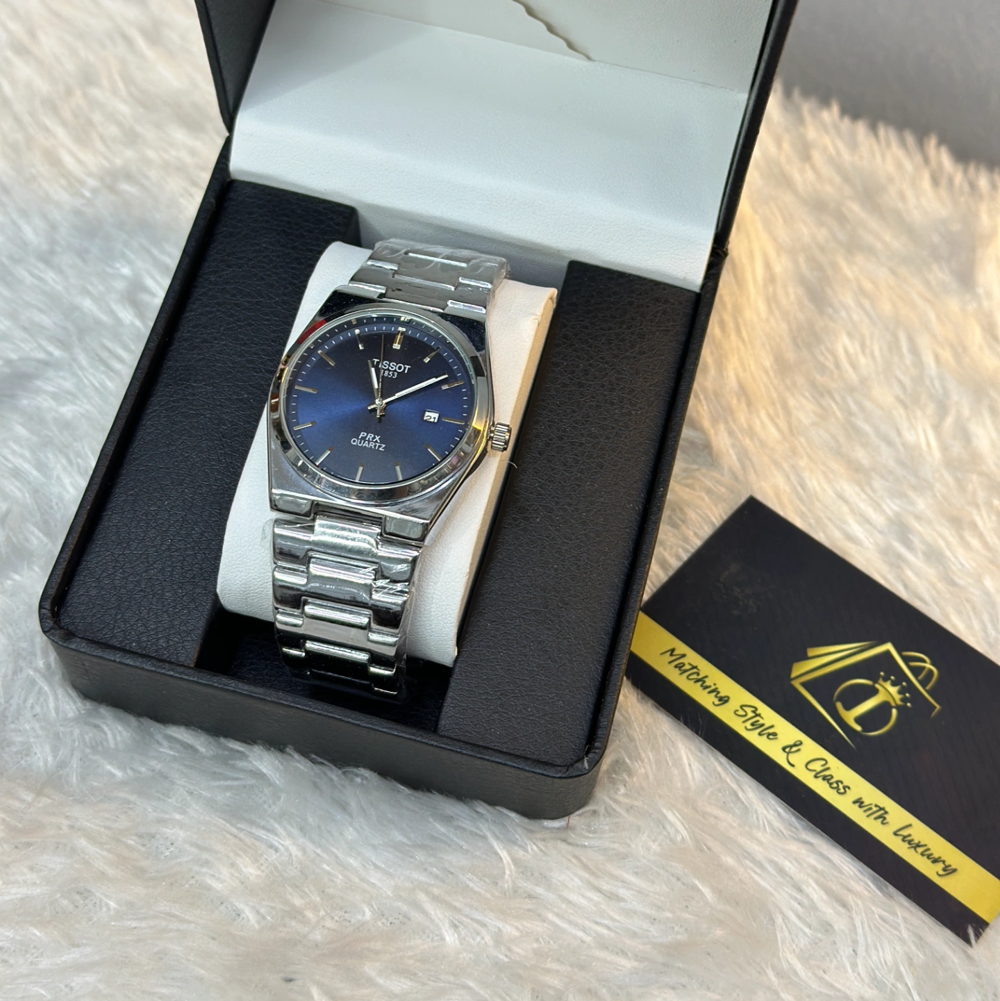 An elegant, vintage-inspired timepiece with an integrated stainless steel bracelet. It features a stunning sunray blue dial with minimalist baton markers and a date window at the 3 o'clock position.