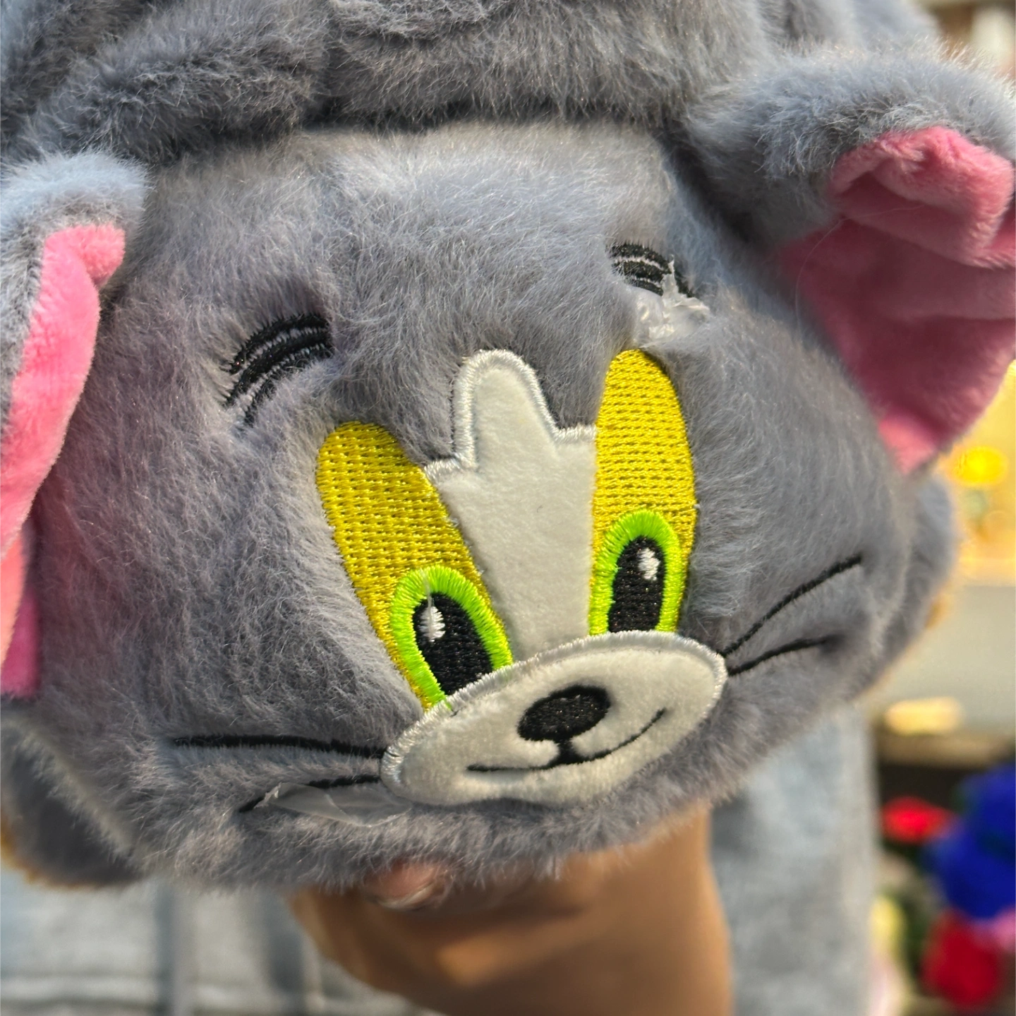Tom: A grey plush with green-and-yellow embroidered eyes and large pink-lined ears.