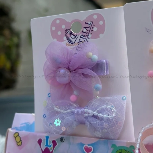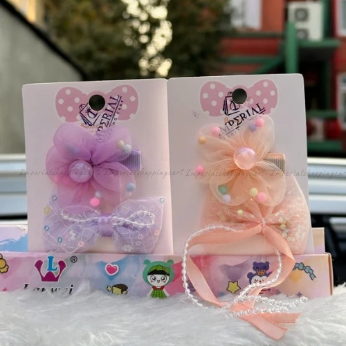 A whimsical set featuring soft, layered tulle fabric shaped into delicate flowers and bows. These clips are accented with iridescent pearls, tiny colorful pom-poms, and a beaded "raindrop" strand for a magical, fairytale look.