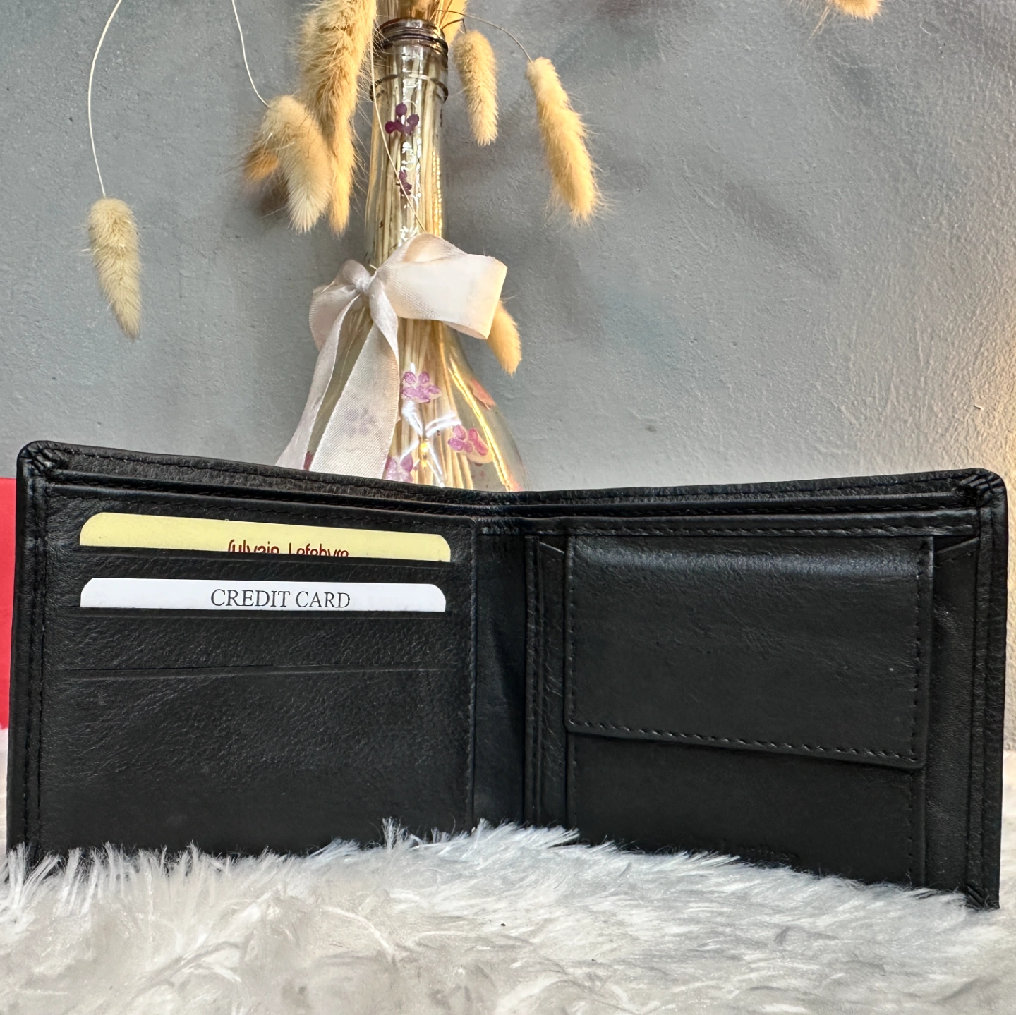 Layout: Standard bifold or trifold design with a focus on organized card storage and a transparent ID slot.