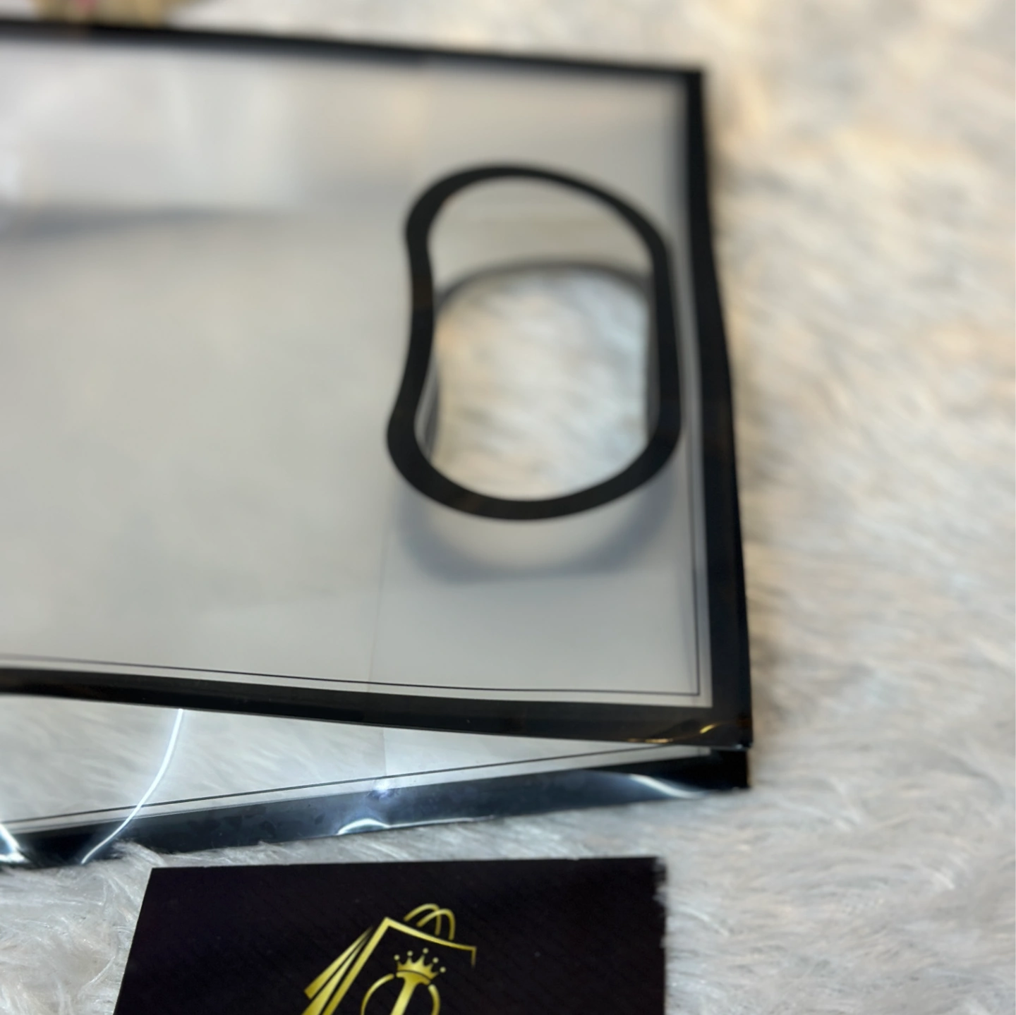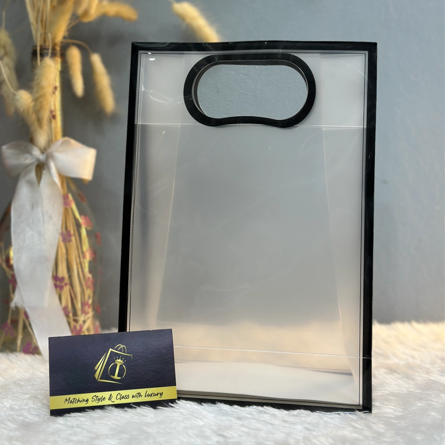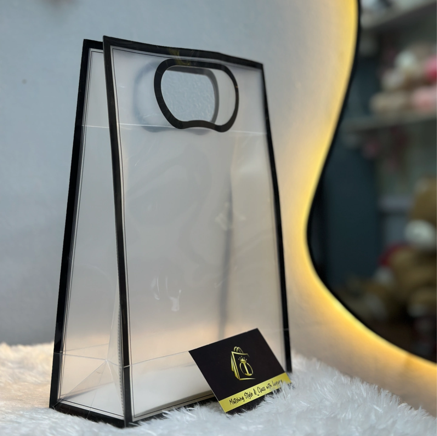 A vertical frosted bag with a striking black frame border and an ergonomic die-cut handle. Ideal for tall items like perfumes or bottles.