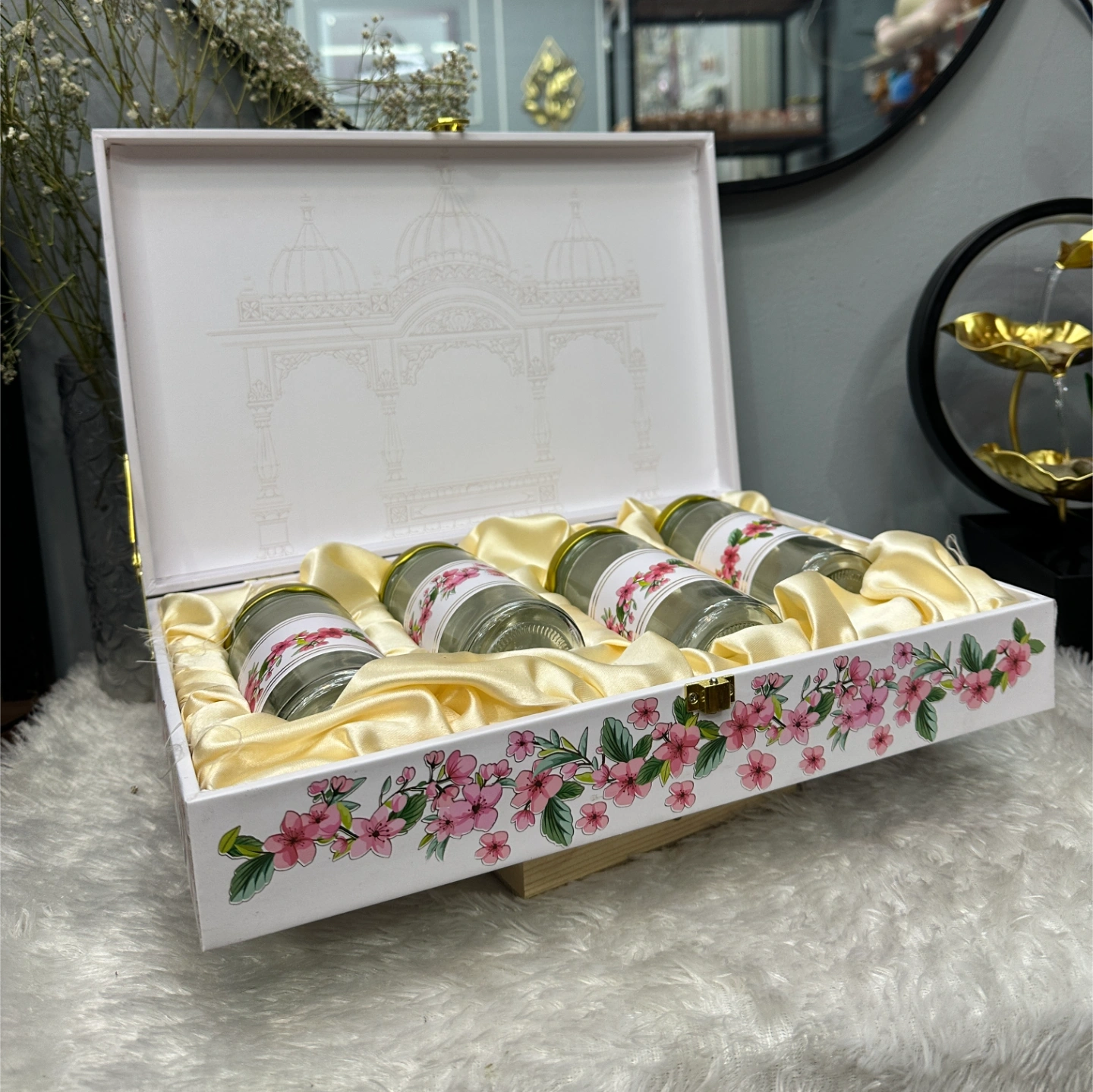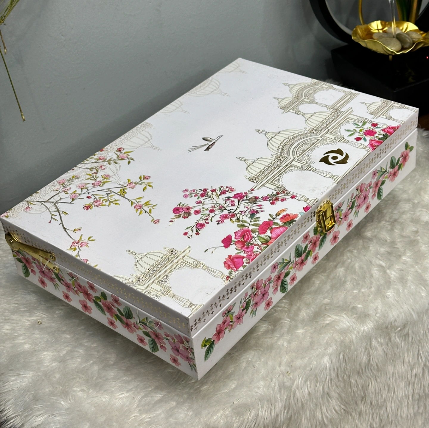 Pure white base with a delicate pink cherry blossom/floral border and a faint architectural sketch on the inner lid.
